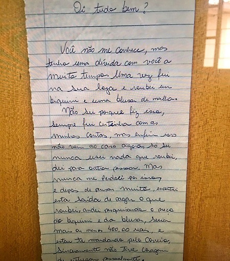 Em carta, mulher pede perdão por furto de 10 anos atrás e devolve R$ 400