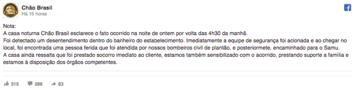 A casa noturna se posicionou pelo Facebook: