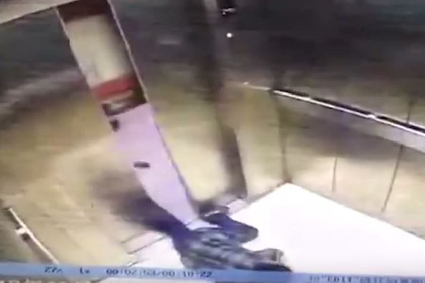 Quando o elevador para, a mulher é vista gritando de dor e pedindo por ajuda