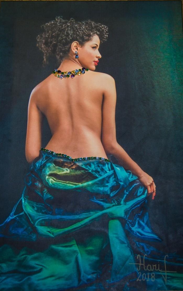 A fotografia foi impressa em telas, finalizada com pintura e gemas de zircônia e encaixes de ouro. A técnica, denominada You Paint, é uma assinatura da artista, que já expôs em diversos países.