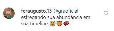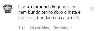 Os fãs, como de praxe, foram à loucura com o clique ousado. Mas alguns apontaram ter levado “bundada na cara” por causa da foto. “Enquanto eu nem bunda tenho, abro o Insta e levo essa bundada na cara”, disparou um internauta.