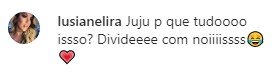 “Oi, bunda!”, “Juju, pra que tudo isso? Divide com nós” e “Meu Deus! Você é muito linda, maravilhosa!”, foram alguns dos comentários que fizeram na postagem da modelo.