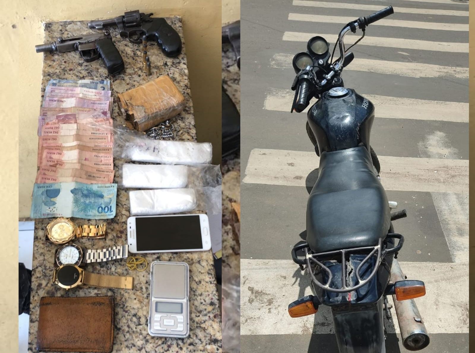 A equipe se deslocou ao local, momento em que abordou um suspeito. Em posse dele foi encontrada uma arma de fogo calibre 32 com quatro munições intactas, além de uma sacola que continha uma balança de precisão, sacos plásticos menores, uma quantia no valor de R$ 286,00 e uma porção grande de maconha prensada.