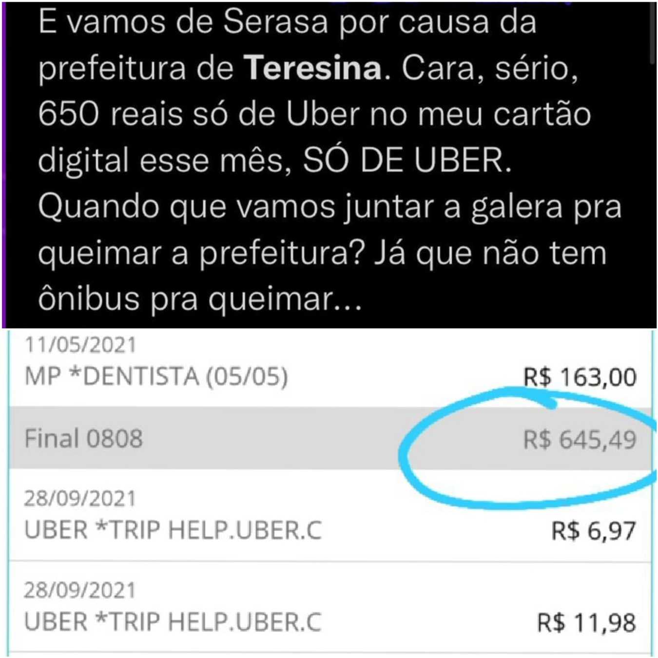 "E vamos de Serasa por causa da prefeitura de Teresina. Cara, sério R$ 650 só de Uber no meu cartão digital esse mês, "só de Uber". Quando que vamos juntar a galera para queimar a prefeitura? Já que não tem ônibus para queimar", disse a jovem.